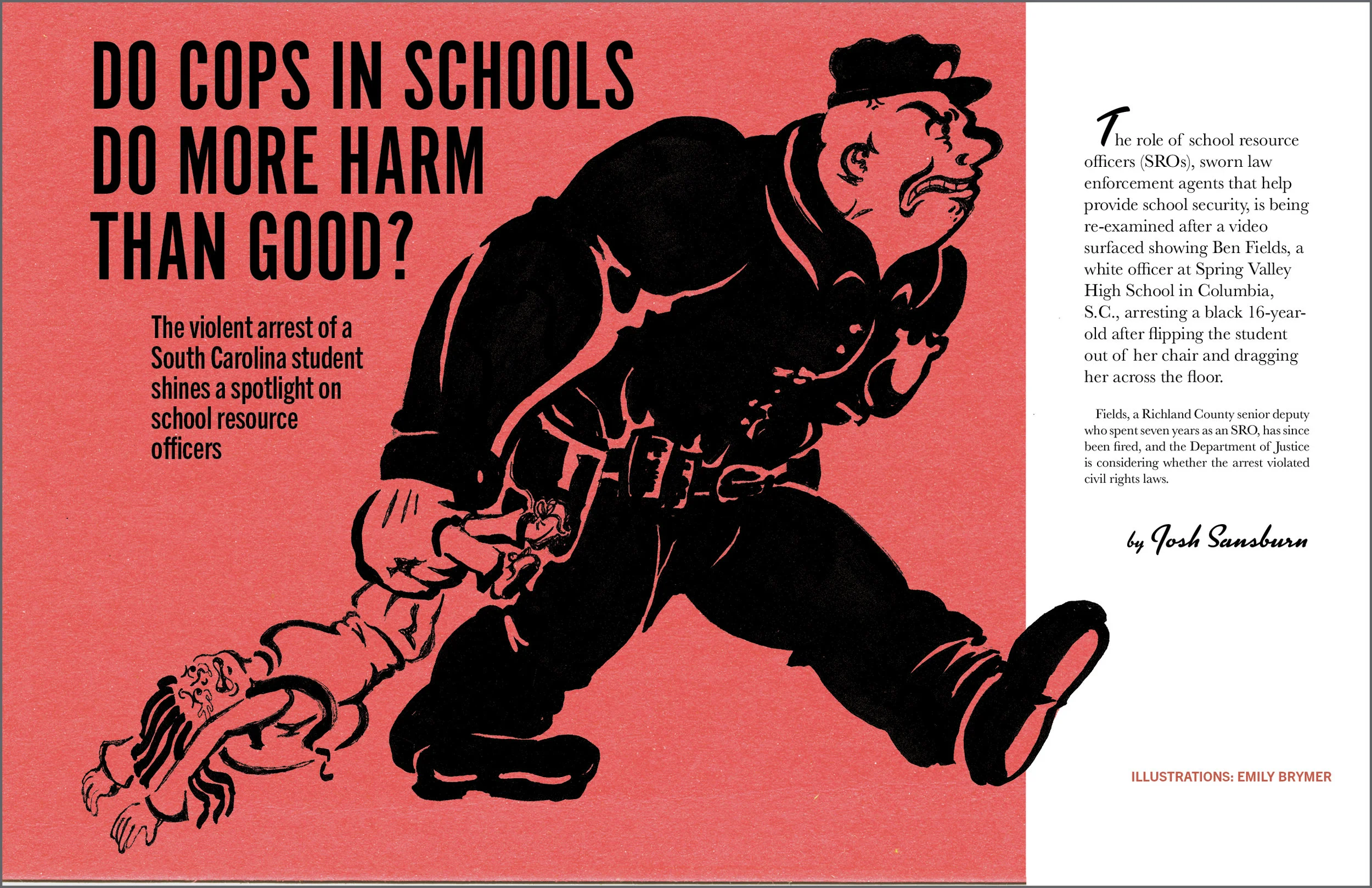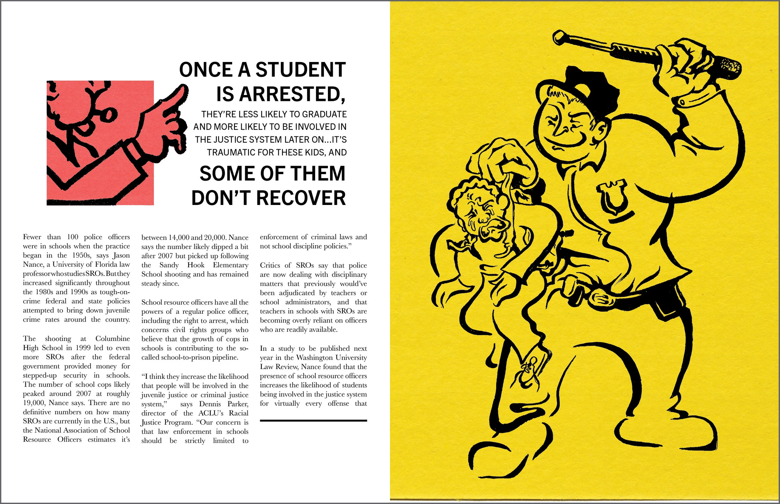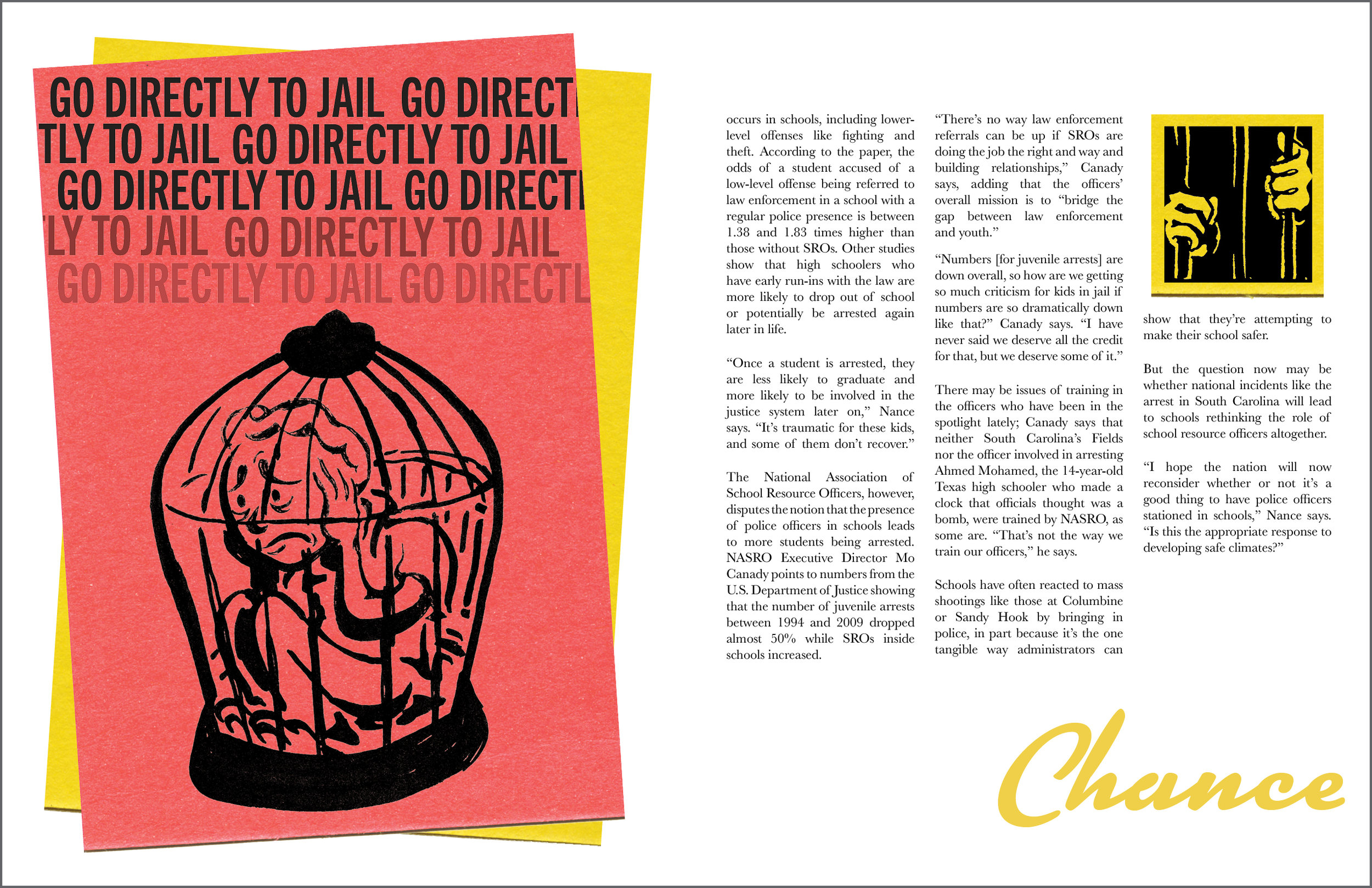Three editorial spreads created for this article. School resource officer brutality is awful and another aspect of institutionalized racism. I emulated Monopoly Jail cards to comment on this brutal, yet common-place public school situation; it's a game students always lose.