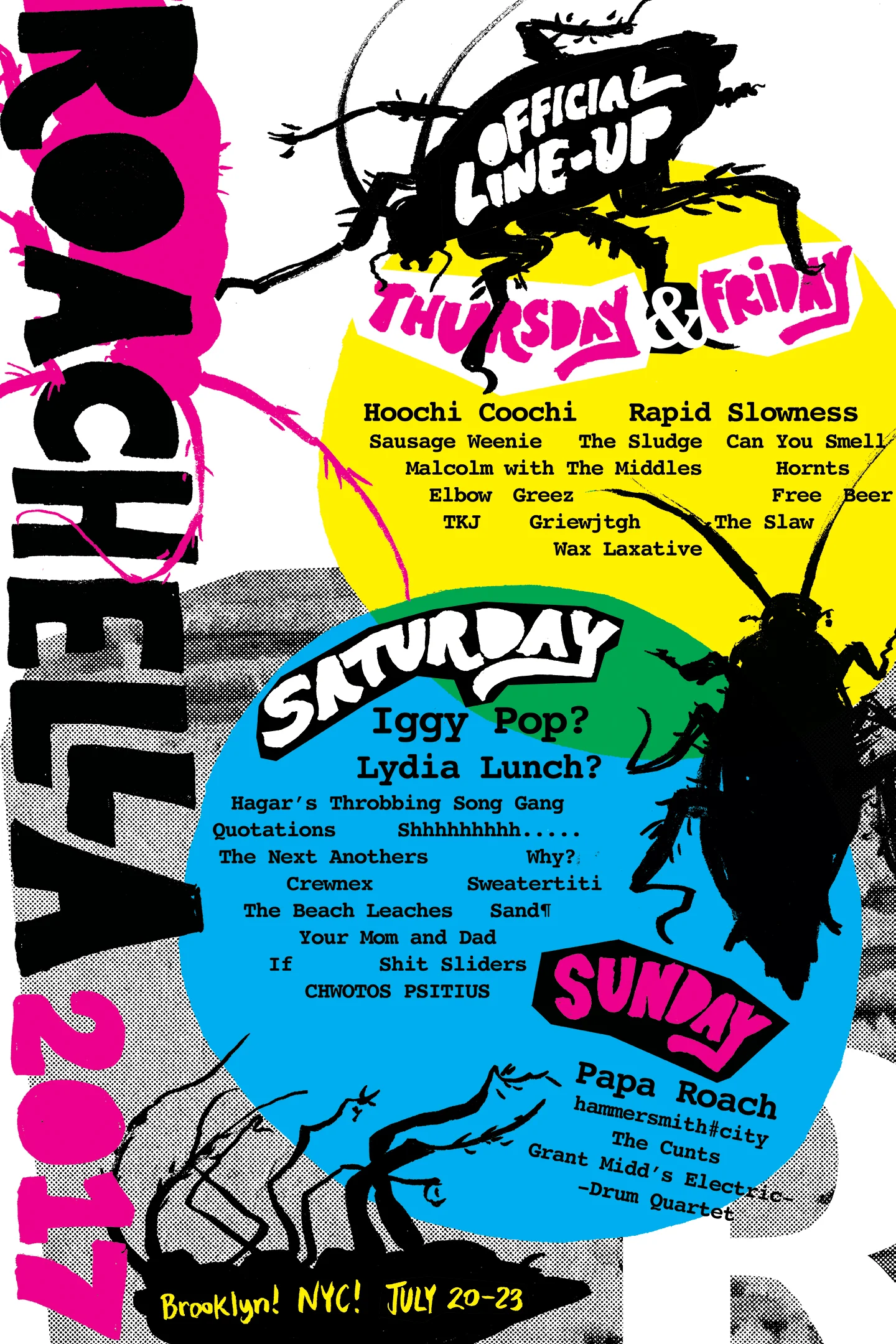 A gross parody of Coachella which will probably never come to fruition. Roachella is an artistic music festival that celebrates filth and punk rock. Although it's poorly organized and located on a literal dump, the event at least has a strong visual brand. (Most bands listed on the line-up poster are fictional).